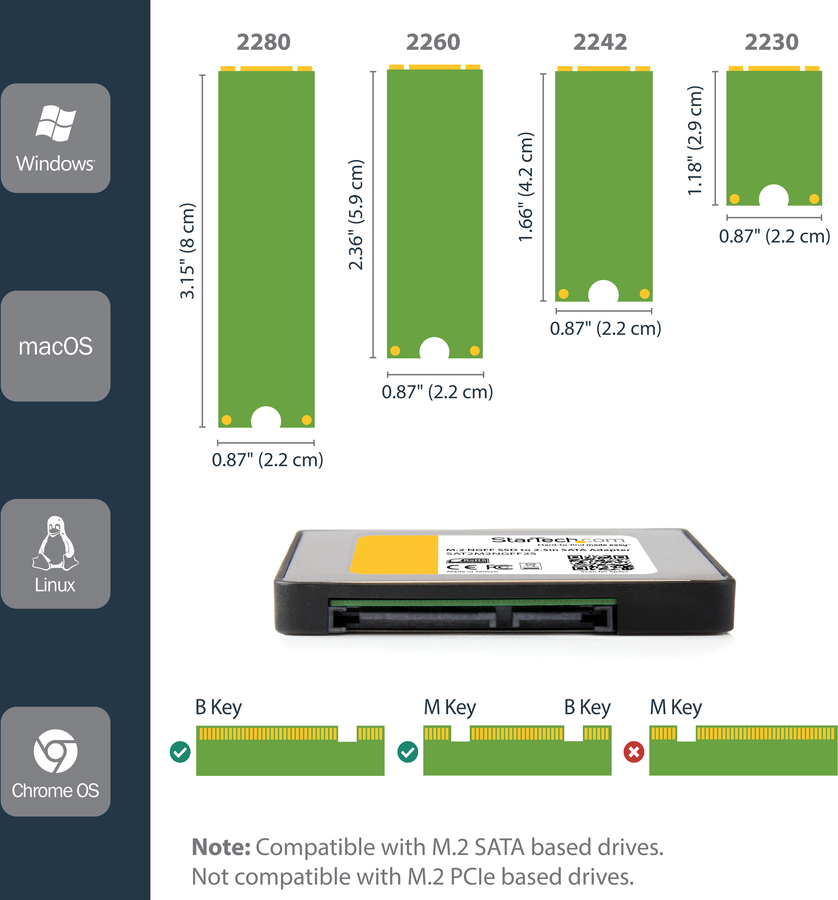 For wide compatibility with all of the common M.2 solid state drives, the SAT2M2NGFF25 supports multiple drive heights including: 2230, 2242, 2260, 2280.