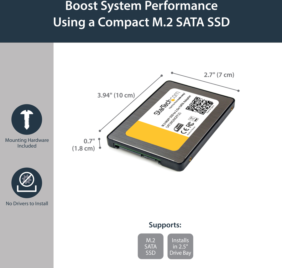 - Added protection for your SSD with enclosed housing - Maximize system performance by replacing you 2.5in SATA platter drive with an M.2 SSD - Broad compatibility with support for the most common M.2 NGFF SSD heights (2242, 2260, 2280) |