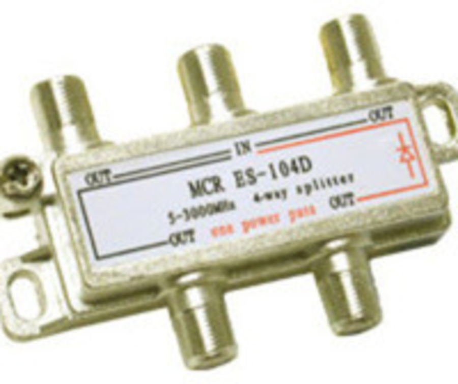 This 4-way splitter is compatible with digital broadcast television, digital cable television, off-air antennas and satellite distribution from 15 to 2,150 MHz. Zinc-plated, die-cast housing with precision-machined ports and a soldered back ensure 140 dB isolation against RF leakage. PC board technology eliminates low frequency hum for less noise, and provides a clean, stable return path for data from the cable box or cable modem. DC-passive for devices requiring DC power such as amplified antennas and DBS dishes. |