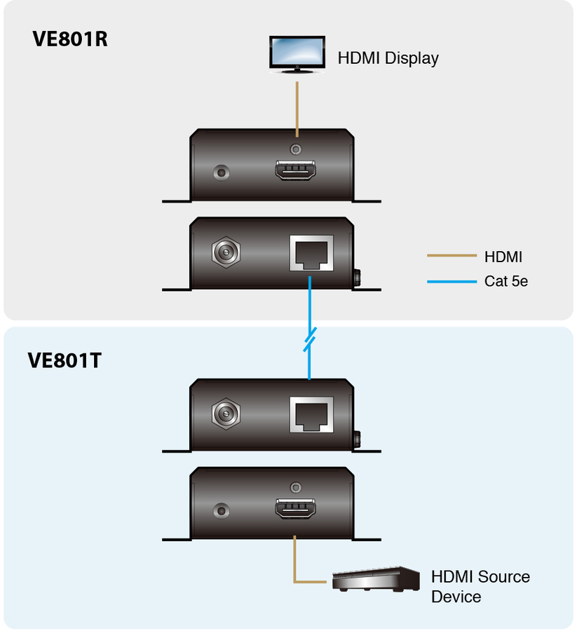 The VE801 HDMI HDBaseT-Lite Extender extends an HDMI signal up to 70m from the HDBaseT source using one Cat 5e/6/6a cable. It supports HDMI features that include 3D, Deep Color and 4K image resolutions, plus Dolby Digital 5.1, DTS HD audio and it is HDCP compatible. The VE801 all-in-one design provides an easy method for mounting the device in any location. The side panel provides slip-resistant grooves that help prevent accidental drops when installing the unit. The grooves also enhance the ability to see the LED status lights. The VE801 is perfect for digital entertainment centers or any installation that requires superior HDMI video quality to be extended for great distances. |