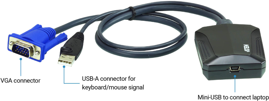 The CV211 Laptop USB KVM Console Crash Cart Adapter provides a direct Laptop-to-Computer connection to servers, computers, kiosks and ATMs. Recommended for on-the-go IT professionals, the CV211 eliminates the need for heavy crash carts while offering BIOS-level access, bi-directional file transfers, hotkey macros, video recording and screenshots through a USB 2.0 and VGA composite cable. 1 x CV211 Laptop USB KVM Console Crash Cart Adapter 1 x USB Type A to USB Mini-B Cable 1 x User Instructions |