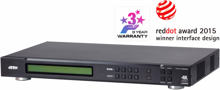 ATEN’s VM0404HB is a True 4K HDMI Matrix Switch series that offers an easy and affordable way to route any of 4 HDMI video sources to any of 4 HDMI displays. Featured with the superior video resolutions up to 4096 x 2160 @ 60Hz (4:4:4), the VM0404HB delivers robust signal routing and ultra-fast digital video switching, making it perfect for applications where routing of True 4K digital signals is required, such as event venues, digital classrooms, auditoriums, department stores, and more.