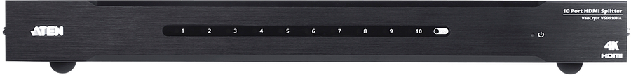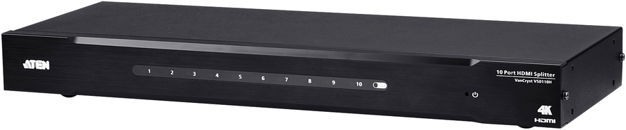 The VS0110HA 4K HDMI Splitter is a perfect solution for applications that require sending one source of high-definition 4K video to ten displays at the same time. The HDMI interface caters to most mainstream sources and sinks, such as DVD players, satellite set-top boxes, and any HDMI displays. Featuring ATEN EDID technology, the VS0110HA guarantees continuous EDID communication with connected devices and maintains optimum video outputs.