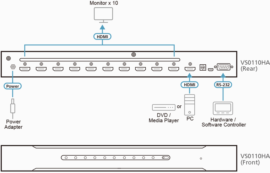 1x RS233, 1x Micro USB, 1x DC IN, 1x HDMI In, 10x HDMI Out |