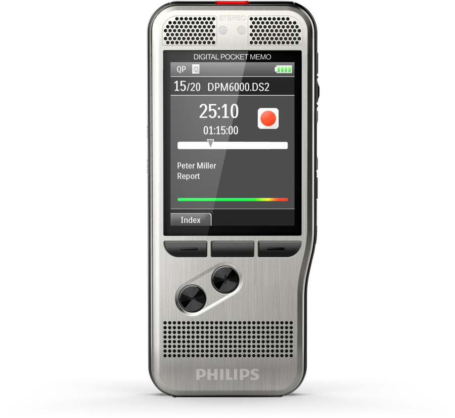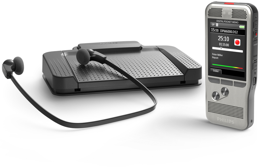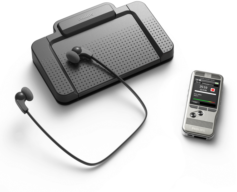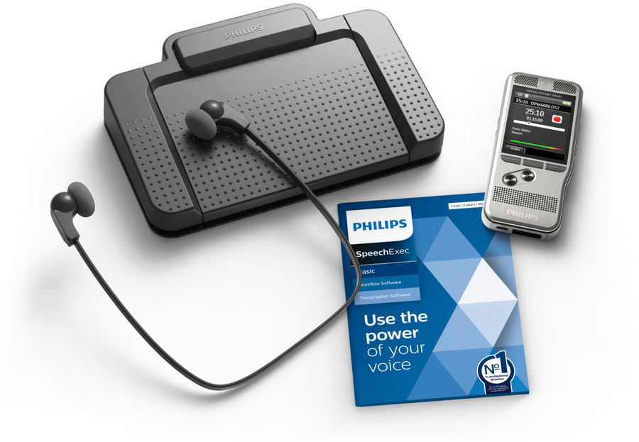 Voice to text made easy with superior recording quality The Philips Dictation and Transcription Set allows you to turn voice into text even quicker than before. The PocketMemo voice recorder combines two microphones for superior audio quality with a robust yet lightweight ergonomic design. Together with the user-friendly software and convenient foot pedal, dictation and transcription has never been easier.
