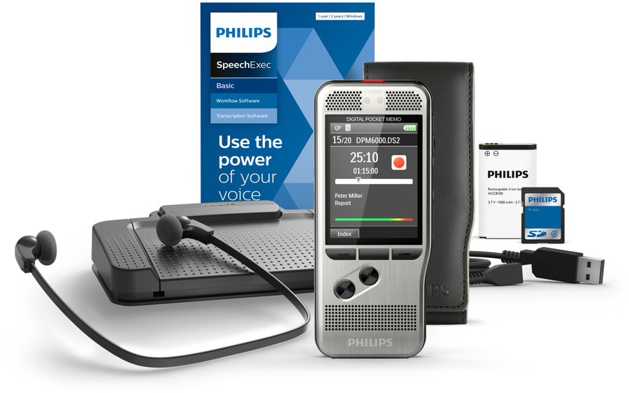 DPM6700, PocketMemo Dictation and Transcription Set, Voice Recorder DPM6000, Foot Control ACC2330, Stereo Headphones LFH0334, Memory card, SpeechExec Basic Transcribe Software (2-year subscription included), SpeechExec Basic Dictate Software (2-year subscription included), Rechargeable battery, USB cable, Pouch