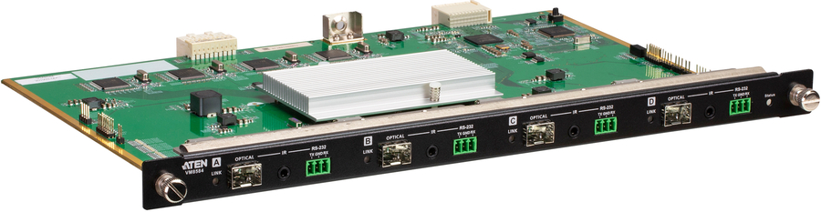 The VM8584 4-Port 10G Optical Output Board offers an easy way to route 4 HDMI sources to HDMI displays through optical extenders, and up to 16/32 input and 16/32 output connections on an ATEN Modular Matrix Switch through various AV interfaces. Designed with fiber optics technology for long-distance transmission, the VM8584 along with its SFP+ module extends uncompressed 4K signal up to 300 m (using VM8584K1) or 10 km (using VM8584K2) over duplex fiber optic cables. The optical fiber simplifies cabling by guaranteeing an interference-free long-haul transmission of audio, video, IR, and RS-232 control signals over one single set of duplex cables that easily connects to the SFP+ slot. Moreover, the VM8584 supports a high data rate of 10.2 Gbps and meets HDMI Specifications that include 3D, Deep Color, and 4K to ensure superior video quality. 1x VM8584 4-Port 10G Optical Output Board 4x SFP+ Modules 4x 3-Pole Terminal Blocks 1x IR Receiver 1x IR Emitter 1x User Instructions |