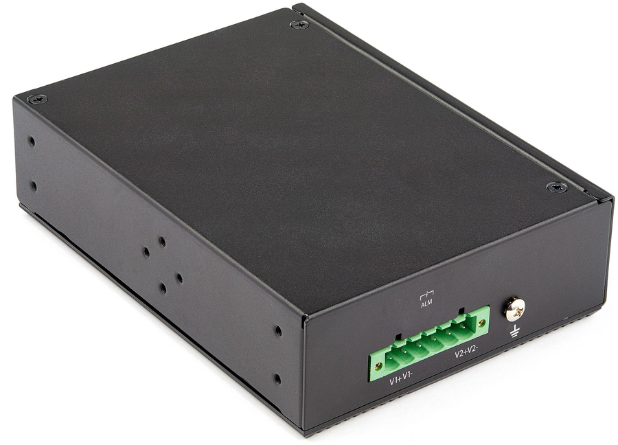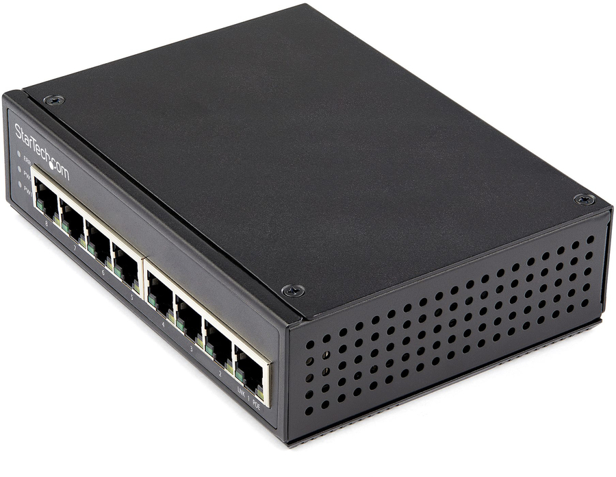This industrial 8 port gigabit PoE switch features 30W of power and is designed to be installed in harsh environments and supports up to a total of 200W power outputs. Includes hardware for DIN rail or wall mounting.