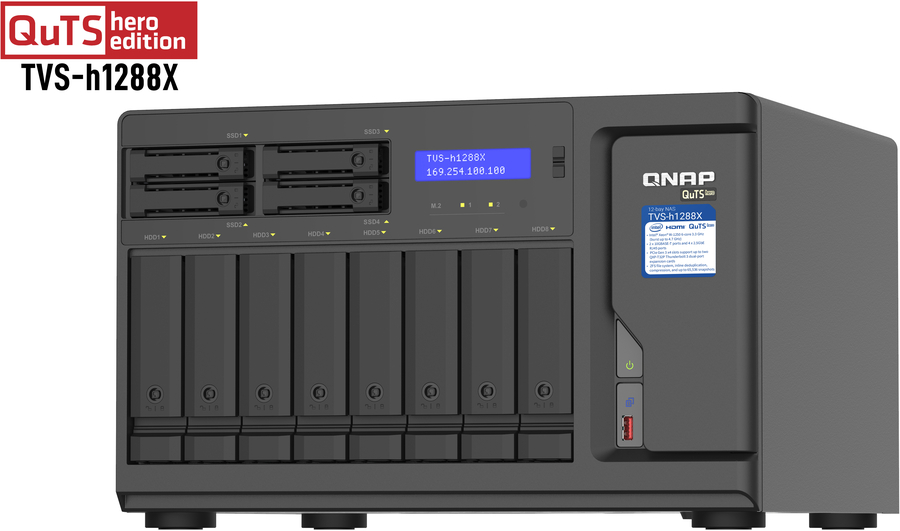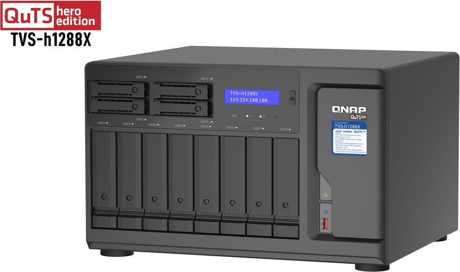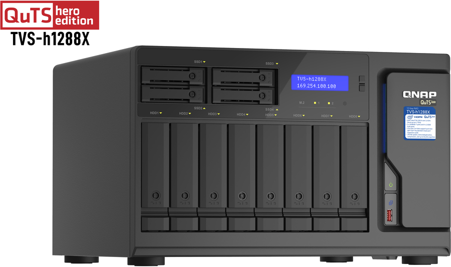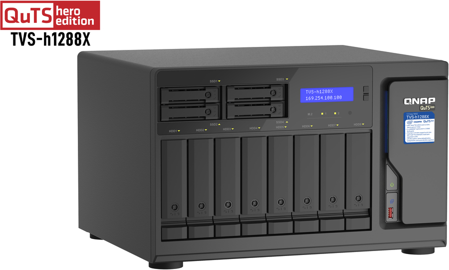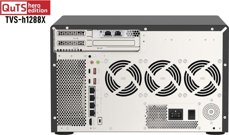 The high-capacity TVS-h1288X features a powerful Intel® Xeon® W processor and allows for installing two QNAP QXP-T32P Thunderbolt™ 3 PCIe expansion cards (sold separately) to attain four Thunderbolt™ 3 ports, making it a perfect match for Thunderbolt™-equipped Mac® and Windows® users for high-speed media collaboration. The built-in 10GbE and 2.5GbE connectivity supports Port Trunking and failover to further satisfy bandwidth and reliability demanding business applications. Running the ZFS-based QuTS hero operating system, the TVS-h1288X supports block-level inline data deduplication and compression, near-limitless snapshots, real-time SnapSync, and read/write cache technologies, helping your business achieve reliable service-level agreement performance, from creative workflows to file server, virtualization server, and efficient file backup and recovery applications.