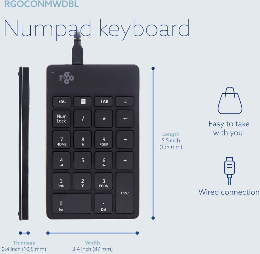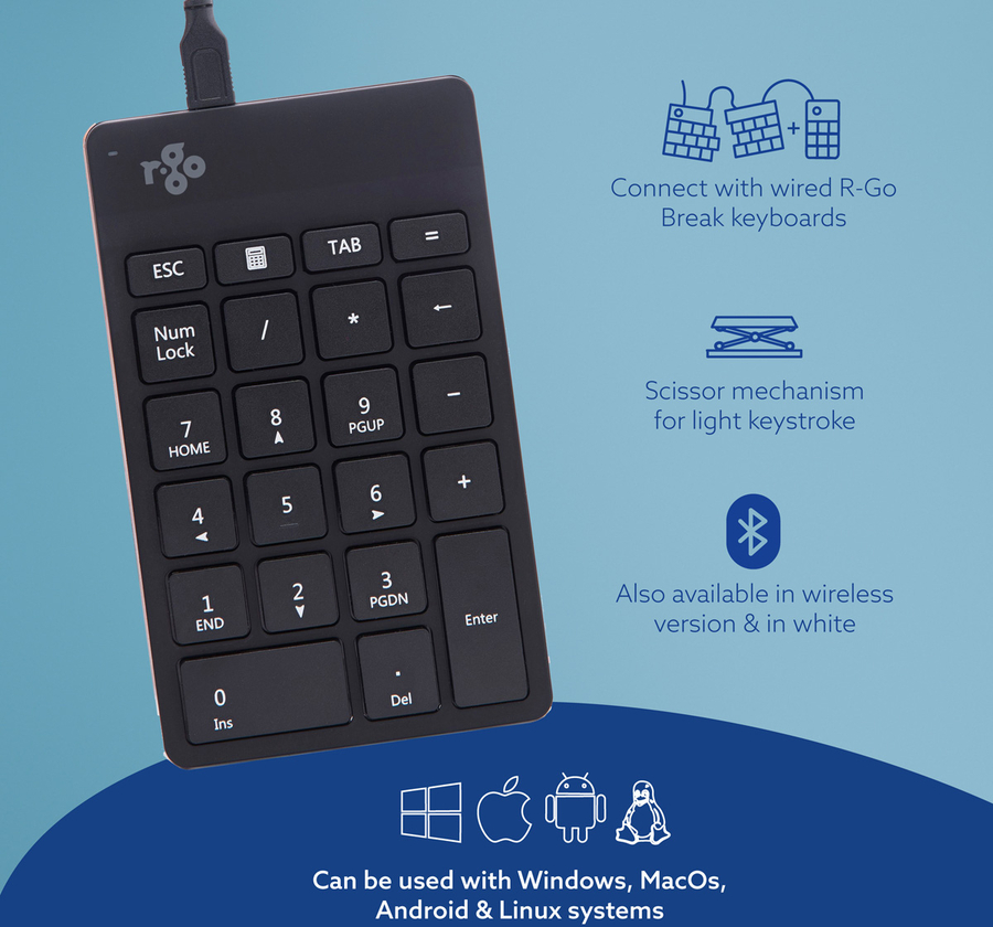 Experience maximum freedom while typing with the R-Go Numpad Break. You can operate this numeric keyboard with your left or right hand and decide yourself where to place it on your desktop. By operating the numpad with the hand that is not using the mouse, both hands remain within shoulder width as you work. The load will be equally divided between both hands. Ideal in combination with the R-Go Compact Break and R-Go Split Break keyboard. The ultra-thin design ensures that your wrists are in a natural, flat position while typing. The special scissor mechanism in the keys ensures a light keystroke, so you need less strenght to type. The R-Go Numpad includes a built-in break indicator, which indicates with colour signals (green, orange, red) when it’s time to take a break. |