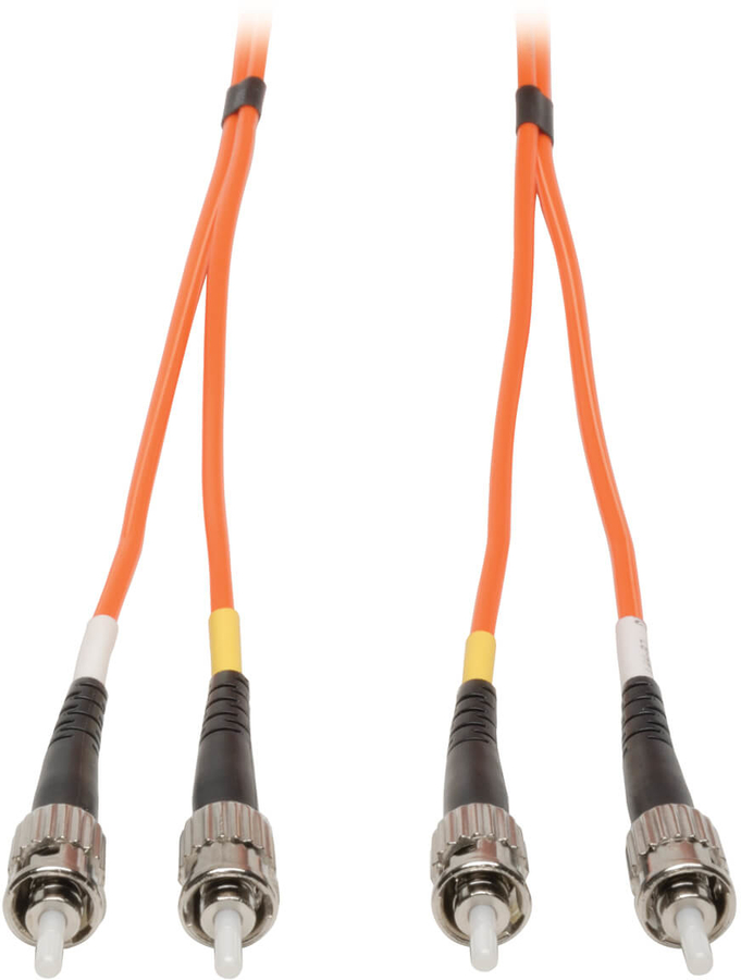 Manufactured from 62.5/125 duplex (zipcord) fiber PVC jacket Length: 50 Meters ( 164-ft.) Connectors: 2 ST connectors on each end Insertion loss testing performed on every connector (0.2db typical) and provided with cable Beveled edge on ends of glass makes insertion of plug a breeze Fiber made from glass (not a polymer) Color coded shrouds identify transmit and receive Duplex multimode fiber is most commonly used in LAN applications t Fiber optic distributed data interface (FDDI) rated OFNR (riser rated) |