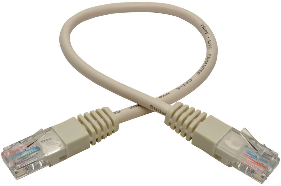 This White Cat5e Ethernet cable has two standard RJ45 molded male connectors featuring integral strain relief. The cable is manufactured from PVC 4-pair stranded UTP and is rated for 350 MHz/1 Gbps communication. Offered in a variety of lengths and colors for all Cat5/5e cabling needs. Snagless Cat5e cables are also available (N001-Series). |