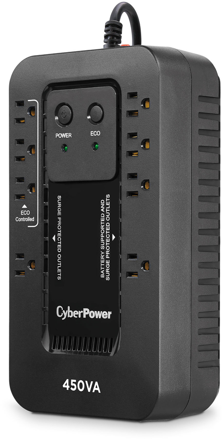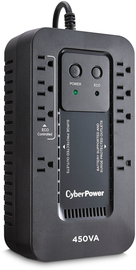 A compact UPS with standby topology, the CyberPower Ecologic EC450G provides battery backup (using simulated sine wave output) and surge protection for desktop computers, workstations, networking devices, and home entertainment systems. During power interruptions, the EC450G offers reliable power protection and battery backup. When the battery backup detects that the computer is off or in sleep mode, computer peripherals connected to the ECO Mode, surge protected outlets will be automatically turned off, reducing power usage and lowering energy costs (USB connection required). The EC450G comes with a three-year warranty (including coverage of batteries) and a $100,000 Connected Equipment Guarantee.