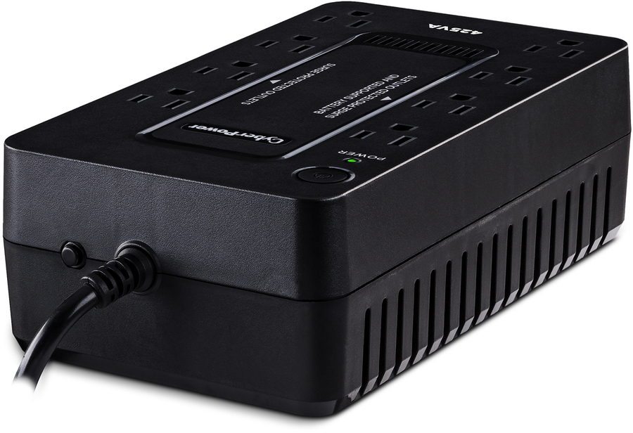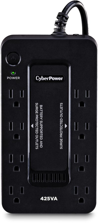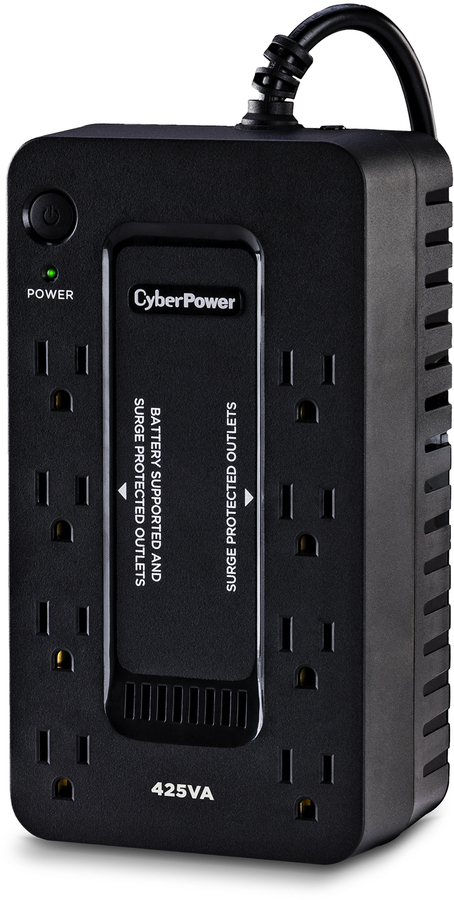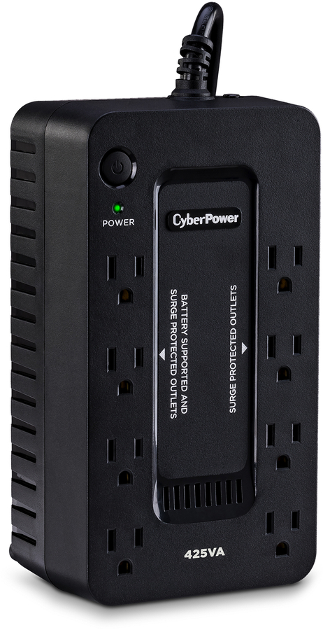 The CyberPower ST425 uninterruptible power supply (UPS) system provides battery backup and surge protection for lightning-induced surges and other power events that can damage electronic equipment. This unit delivers enough battery backup to power connected electronics through utility power failure and enough runtime to perform a proper shutdown to protect against the loss of data and damage to valuable electronics during longer outages. Including a sleek design, this UPS is perfect for all your home office and entertainment needs, including computers, gaming consoles, and broadband routers.
