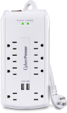The Professional Surge Protector CSP806U from CyberPower offers vital surge protection for common home and office devices such as computers and electronics. It prevents spikes in energy caused by storms and electrical power surges and is ideal for safeguarding personal computers, phones/faxes/modems, and other consumer electronics. The CSP806U provides 3000 joules of protection and eight surge-protected outlets. Its two USB charge ports (2.4 Amp shared) keep tablets, smartphones, and other rechargeable electronics ready to use. The 6 ft. power cord has a right-angle plug with a 45° off-set.