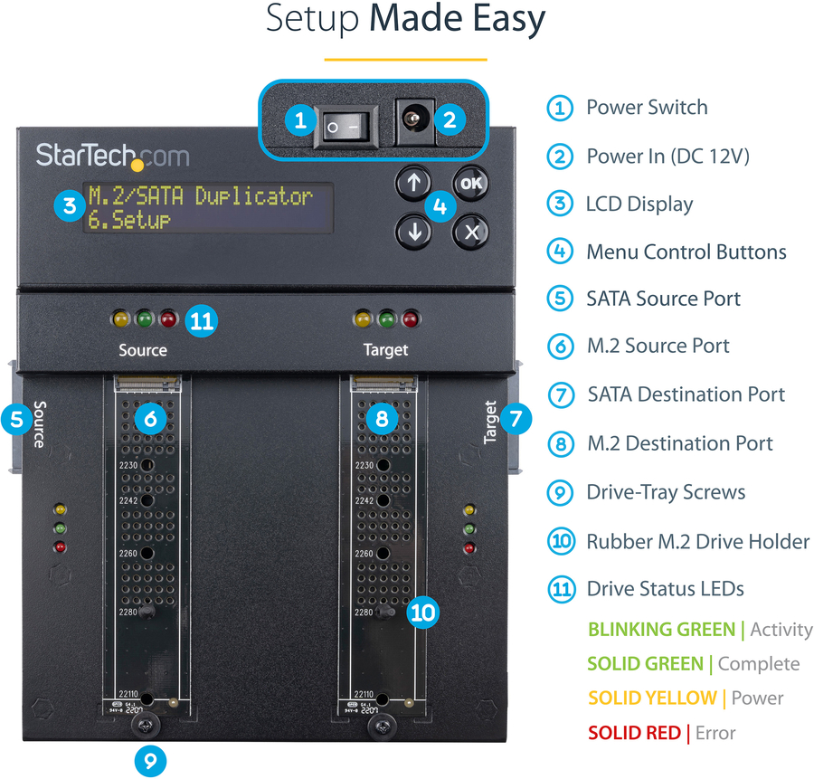 Featuring an intuitive button-operated interface, and full on-screen display (OSD) for increased manageability, this drive duplicator and cloner is easy to operate. To monitor and observe your duplication and erasing processes the device features LED indicators for Power/Activity, Status and Errors, and the OSD Menu options include Error Reporting, and Presenting Drive Info.