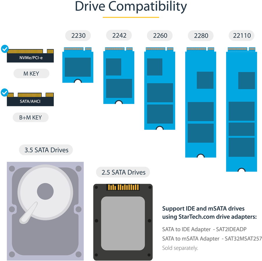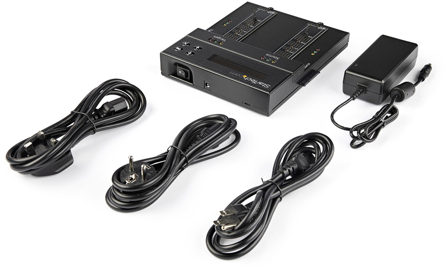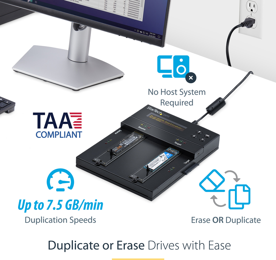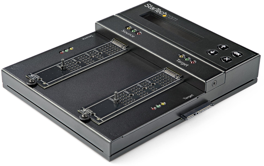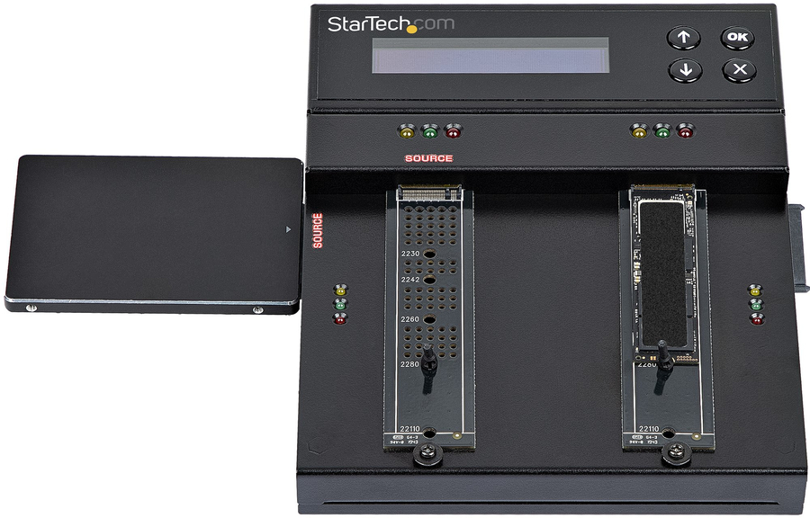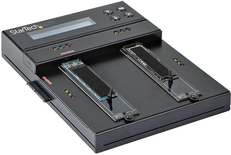 Supporting different types of drives including M.2 PCIe (M-Key), M.2 SATA (B+M-Key), and SATA 2.5/3.5 in. drives, this HDD/SSD cloner and wiper provides a versatile solution for drive cloning and deleting applications. The drive cloner enables duplication with any combination of drives, supporting duplication between M.2 (NVMe/AHCI), M.2 SATA, and 2.5/3.5" SATA drive interfaces. You can also expand the capabilities of the device to supporting IDE and mSATA drives using StarTech.com drive adapters: SATA to IDE Adapter (SAT2IDEADP) / SATA to mSATA Adapter (SAT32MSAT257) (each sold separately).