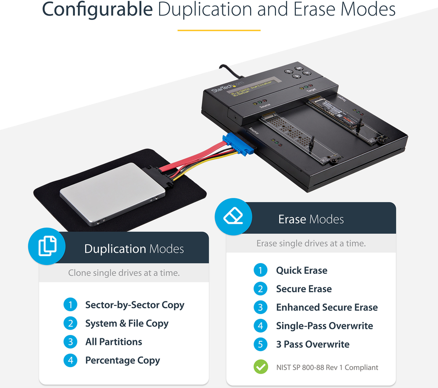 To support a wide variety of applications this drive cloner and sanitizer supports different duplication and erasing modes with Adjustable Host Protected Area (HPA) settings to include/exclude partitions. When duplicating the device supports: System & File, All Partitions, Whole Drive and Percentage Duplication. When erasing the device supports: Quick Erase, Full Erase (Single & 3-Pass) and Secure Erase (Clear/Purge, meets NIST SP 800-88 Rev 1).