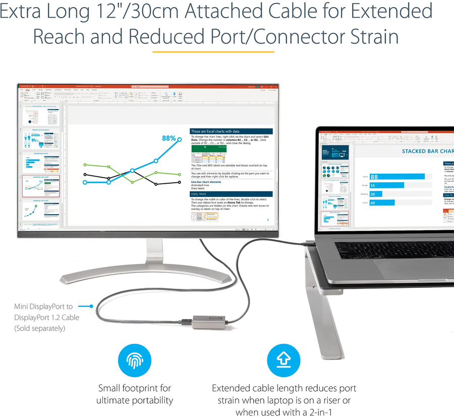 This USB C adapter dongle is equipped with an extra-long 12" (30cm) attached cable, providing an extended reach to reduce port and connector strain on 2-in-1 devices or laptops on risers stands.