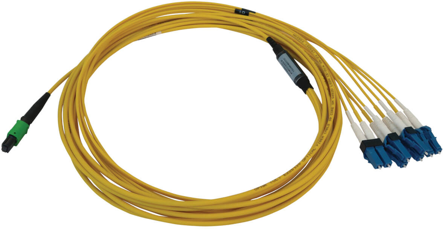 40/100/400 GbE Cable Supports Higher Bandwidths for High-Density Data Networking The N390X-05M-8L-AP is a premium multimode fiber optic cable that supports 400 Gb Ethernet speeds for transmitting data and voice signals over short distances. It is designed to support higher bandwidths for high-density patching between data center MDFs and IDFs in enterprise installations. This singlemode 9/125 OS2 cable is an ideal choice for 100 Gb Ethernet applications up to 100 meters (328 feet) at 1550 nm. The breakout cable also eliminates the need for long fan-out cables or long individual duplex cable runs.