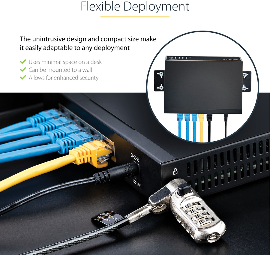 The 2.5G switch offers a security K-slot for more permanent and secure setups (cable not included). The unintrusive design and small dimensions (6.1x4.7x1.1 inch / 155x120x30 mm) make it easily adaptable to any deployment and has clear diagnostic LEDs that show the status of the devices at a glance. Additional features such as 9K jumbo frames, full-duplex, 16K MAC address table, QoS IEEE 802.1p, and wall mounting kit give you the flexibility to use it in a multitude of scenarios.