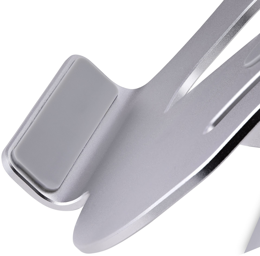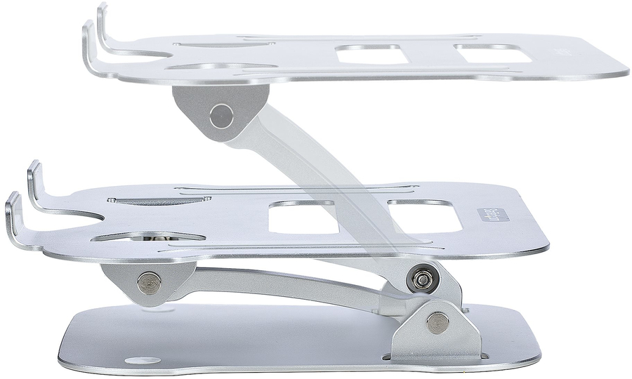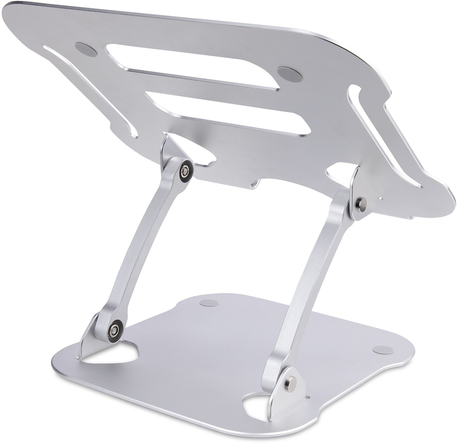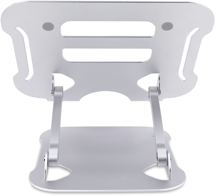 The laptop riser features a silver anodized finish with aluminum construction to ensure durability and sturdiness. The vented surface area is elevated to promote passive cooling and airflow. The space underneath the laptop platform can be used to store a keyboard, mouse, and/or other accessories and peripherals when they are not in use.