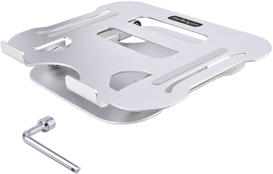This ergonomic laptop stand features tilt and height adjustments (up to 4.7in/12cm) to establish the most comfortable viewing angle. Adjust the tension of the support arms, using the included tool, for various weight, tilt, and height settings. The raised flanges (0.7in /18mm), located at the front of the laptop platform, ensure the laptop remains in place when the platform is tilted. Rubber pads around the surface help protect the laptop from cosmetic damage.