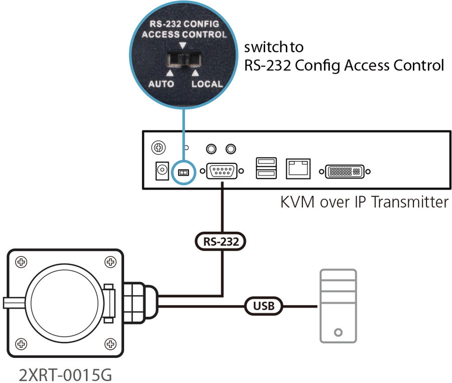 Note: 1. Please scroll down for more about compatible products. 2. The slide switch on the rear side of the KVM over IP Transmitter needs to be switched to the RS-232 Config / Access Control position. 3. Connect the RS-232 connector of the 2XRT-0015G to the RS-232 Port of the KE Transmitter and connect the USB connector of the 2XRT-0015G to a computer for USB bus power supply. |