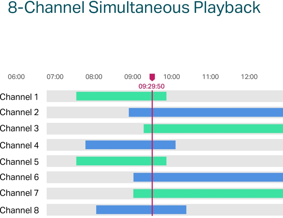 Reviewing footage is faster than ever. 8-Channel Simultaneous Playback Replay the feed from up to 8 cameras at the same time, increase replay speed, and find events in the video schedule to easily review footage.