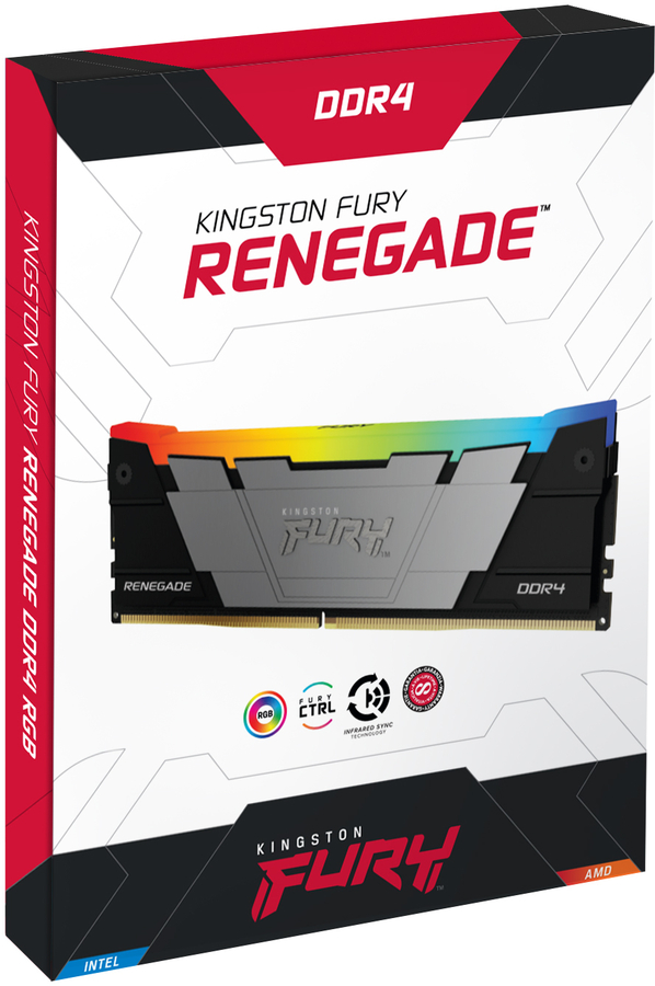 Kingston FURY™ Renegade DDR4 RGB* is the ideal upgrade for the power user who wants cutting-edge performance, with stylish RGB in their AMD- or Intel-based system. 10 LEDs create dynamic RGB lighting with Kingston FURY's patented Infrared Sync Technology™ for smooth, coordinated effects. Put in hours for work or play, crank up your frame rate, improve your workflow and edit gameplay in a flash thanks to speeds of up to 4600MT/s[*]* paired with quick latencies. The intense, stylish two-tone black heat spreader with black PCB is for fun and function to keep your system cool.