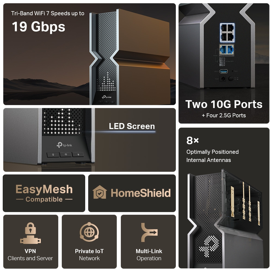 Redefining WiFi Routers BE19000 Tri-Band WiFi 7 Router - 3.6× Faster Speeds with 19 Gbps Tri-Band WiFi - Ultra Smooth WiFi with 4× Lower Latency - Multi-Gig Connectivity with Two 10G Ports
