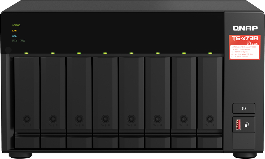Featuring an AMD Ryzen™ V1000 series V1500B quad-core processor that delivers great system performance with up to quad-core / 8 threads and Turbo Core up to 2.2 GHz. The TS-873A features two 2.5GbE RJ45 ports and two PCIe Gen 3 slots for you to flexibly deploy 5GbE/10GbE networks. Two M.2 NVMe SSD slots for Qtier Technology and SSD Caching enable constant storage optimization. The TS-873A supports QTS and QuTS hero, allowing users to flexibly switch operating system based on their requirements.