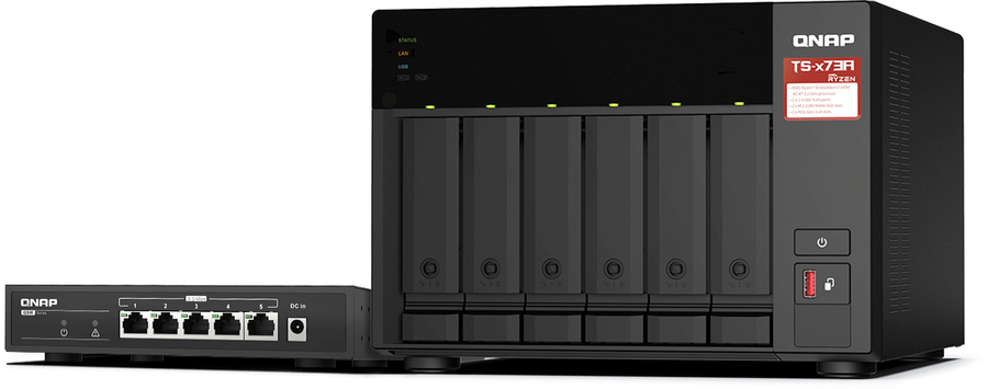 Enjoy 5Gbps speeds without an extra network card Enable SMB Multichannel on TS-673A NAS to combine two 2.5GbE ports for up to 5Gbps transmission speed. This increased bandwidth greatly accelerates large file transfer/backup and video editing applications.
