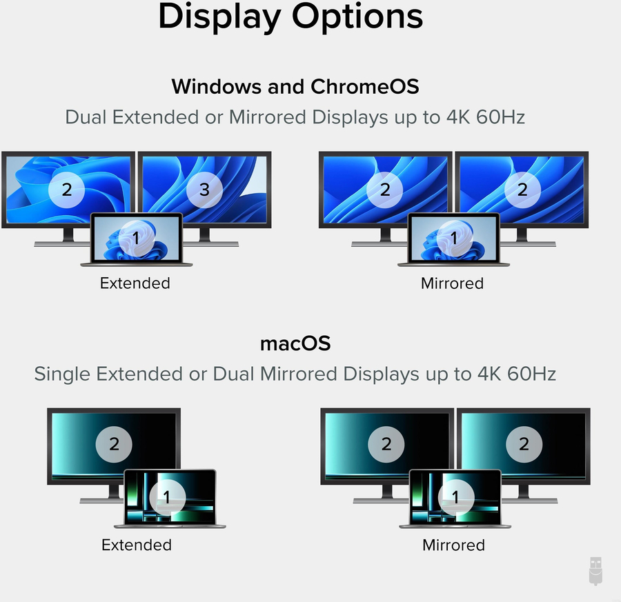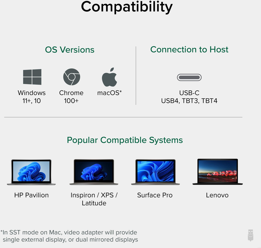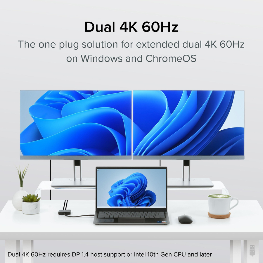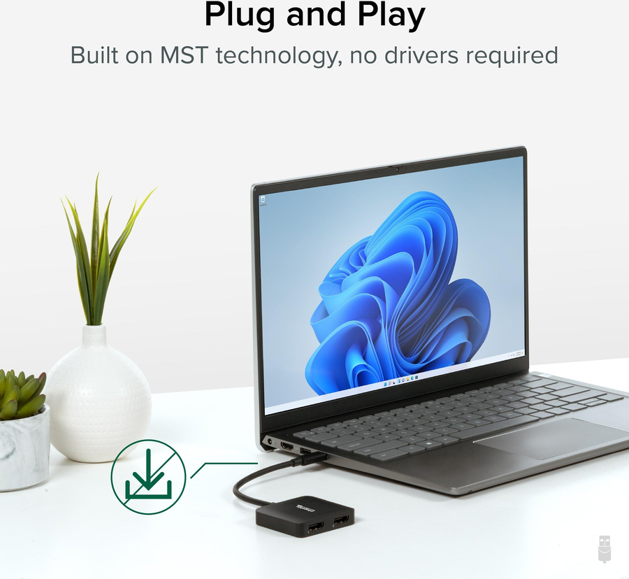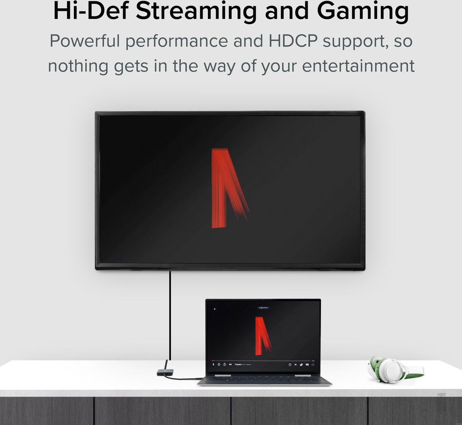 Compatible with Windows and Chrome computers with USB-C DP 1.4 support—so most modern laptops—a single USB-C port can be used to extend your display across two 4K screens at 60Hz with this adapter for monitor to usb. Designed around Multi-Stream Transport (MST), the display uses Alt Mode graphics and an MST chip to drive two independent displays natively from the host laptop—no driver installation required. And with HDCP support—something a lot of video adapters don’t have—you can play copy-protected media through streaming services like Netflix and Hulu.