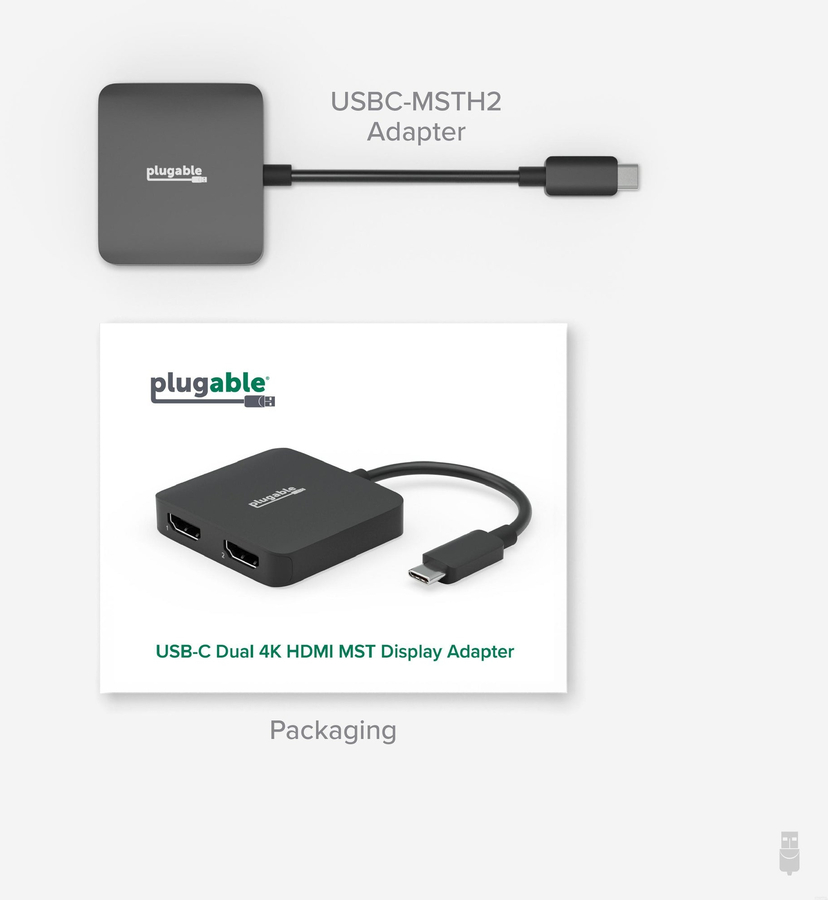 You have two 4K HDMI screens and one USB-C port. It’d be nice to find an easy way to combine them with a cost effective docking station alternative. Now the Plugable USB-C Dual 4K HDMI MST Display Adapter (USBC-MSTH2) has you covered.