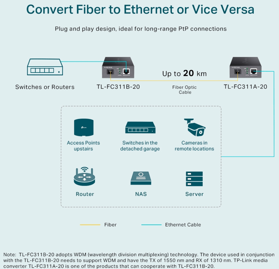 How This Product Works TL-FC311B-20 adopts WDM (wavelength division multiplexing) technology, helping send and receive data at a distance of up to 20 km with only a single mode fiber, which saves half of the cable deployment cost for customers. TL-FC311B-20 transmits data at 1310 nm wavelength and receives data at 1550 nm wavelength on optical fiber. Therefore, the terminal device used in conjunction with the TL-FC311B-20 should send data at a wavelength of 1550 nm and receive data at a wavelength of 1310 nm. TP-Link another media converter TL-FC311A-20 is one of the products that can cooperate with TL-FC311B-20.