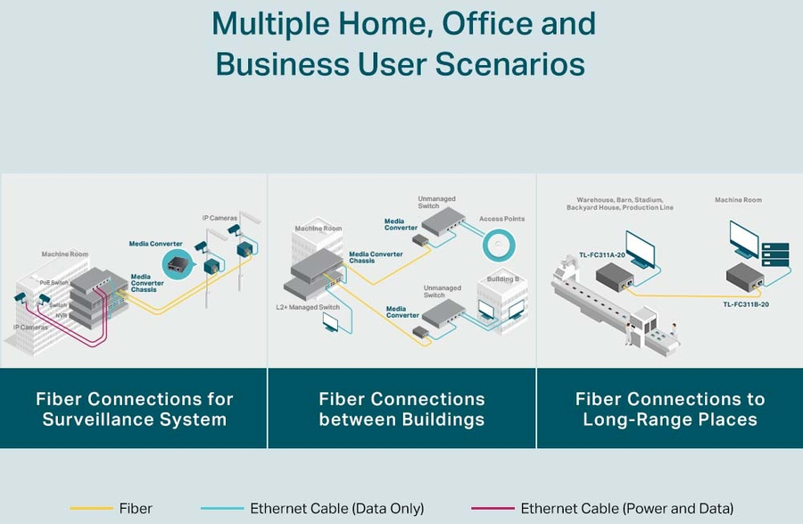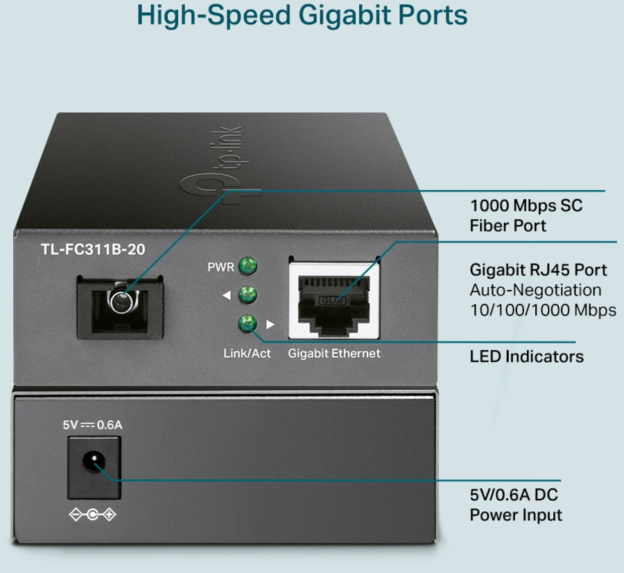 What This Product Does TL-FC311B-20 is a gigabit media converter, providing a gigabit RJ-45 port and a gigabit SC fiber port, which can convert between electrical and optical signals. And long-distance data transmission through optical fiber can be applied to commercial scenarios such as park security monitoring and wireless networking.