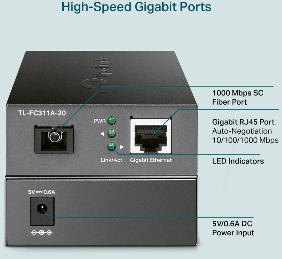 What This Product Does TL-FC311A-20 is a gigabit media converter, providing a gigabit RJ-45 port and a gigabit SC fiber port, which can convert between electrical and optical signals. And long-distance data transmission through optical fiber can be applied to commercial scenarios such as park security monitoring and wireless networking.