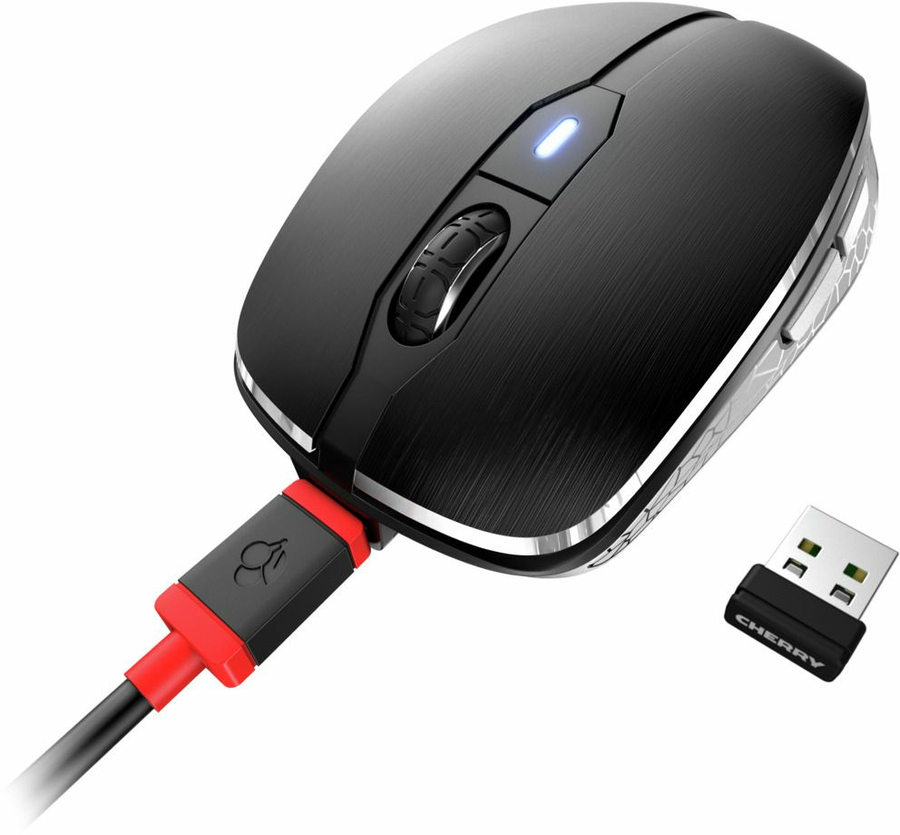 The CHERRY MW 8C ADVANCED combines fine materials, a timeless design and the very latest technology to form a top class wireless mouse. The anodized aluminum surface, rubber side parts and compact design mean that it fits snugly in the user’s hand. The first time the user touches the device, it becomes clear that this mouse stands out from the crowd and is aimed at users with sophisticated requirements. The highly precise sensor with a laser LED allows the mouse to be used on nearly every surface, including glass. The resolution can be set in four stages at the touch of a button: 600, 1,000, 1,600 or 3,200 dpi. This means the mouse is ready for use with high-resolution 4k monitors. The installed rechargeable lithium battery can be simply charged with the supplied USB cable – even while you work. The generous capacity of 550 mAh means that one charge suffices for several weeks of uninterrupted productivity. A two-colour status LED provides the user with information on the battery status, the charging status, the selected resolution or the connection status at all times. Unlike a conventional mouse, the wireless mouse can be connected either with the supplied 2.4 GHz wireless USB receiver or via Bluetooth®. You can change connection types quickly using a switch on the base of the mouse. This allows e.g. a laptop to be connected via Bluetooth® and a PC to be connected via a regular wireless connection and both to be operated with the same mouse. Simply press the switch to toggle between the two devices. The data are transferred using an AES-128 encryption in both cases. In addition to this, the CHERRY MW 8C ADVANCED has a number of other impressive features and subtle details. A highly durable mouse wheel with optical scanning, a magnetic latch for the USB receiver as well as a transport pouch. The attention to detail of this mouse leaves nothing to be desired and it is equally suitable for mobile and stationary applications. |