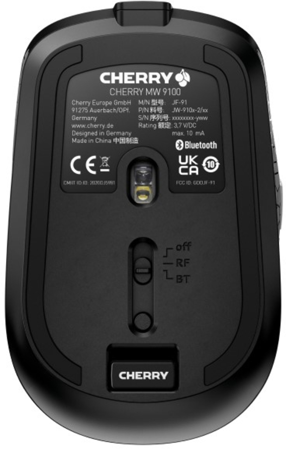 With its rubber side panels and compact shape, the wireless CHERRY MW 9100 computer mouse fits snugly in your hand. By pressing the DPI button, you can adjust to a high resolution of up to 2,400 dpi in 3 steps : 1,000, 1,600 or 2,400 dpi. The built-in lithium battery charges using the included USB-C cable even when the mouse is being used. One charge can then last for several weeks. The two-color status LED provides information on the battery status, the charging status, the connection status, or the current resolution. For maximum flexibility, you can connect the CHERRY MW 9100 without cables either via Bluetooth® or with the included 2.4 GHz wireless USB receiver. You can toggle between these connection types using a slide switch on the bottom of the mouse, so for example, you can connect to a laptop via Bluetooth® and a PC via the USB dongle, meaning you can now operate both devices with the same mouse. Data is transferred using AES-128 encryption in both cases. But that's not all: A durable mouse wheel, a magnetic lock for the USB receiver and a practical carrying pouch: Let all the little details of the MW 9100 wow you, and you’ll love with this wireless mouse both on the road and in the office. |