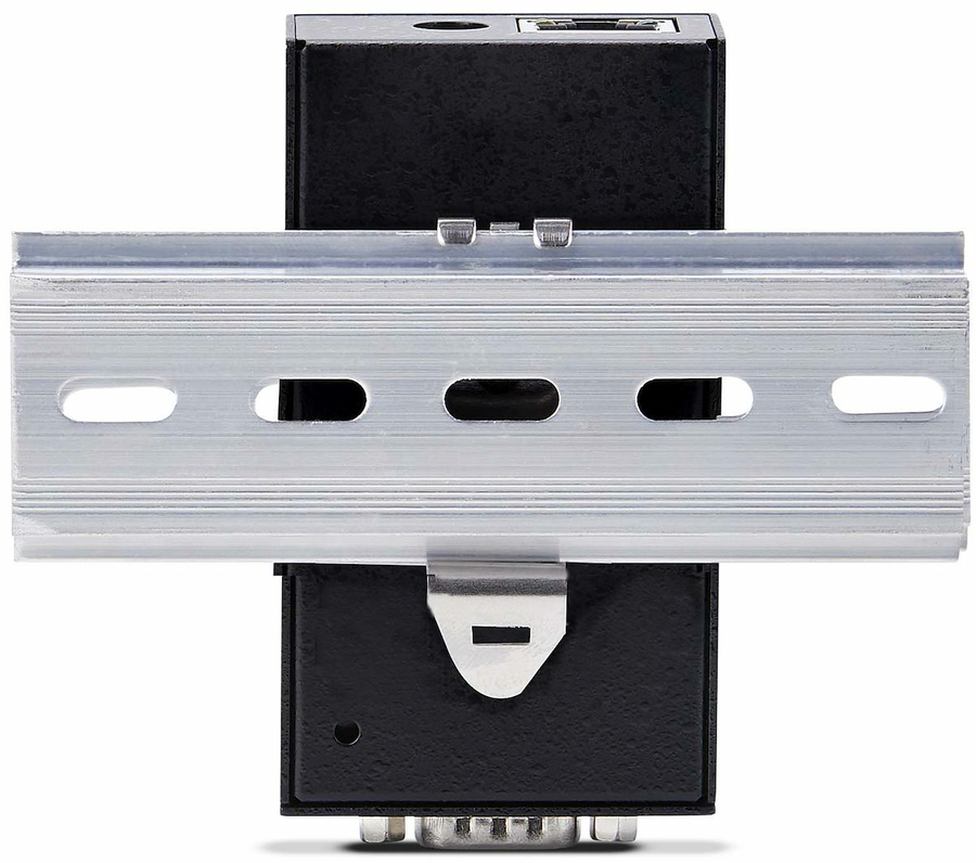 The converter is housed in a full metal enclosure for durability in harsh environments. The DB9 over IP converter includes all necessary wall and DIN rail mounting hardware. Multiple mounting holes along the chassis allow it to be installed in the most useful orientation for any application. The compact design of 1.8x1x3.2in (46.1x 25x 81.9mm) is ideal for environments where space is at a premium.