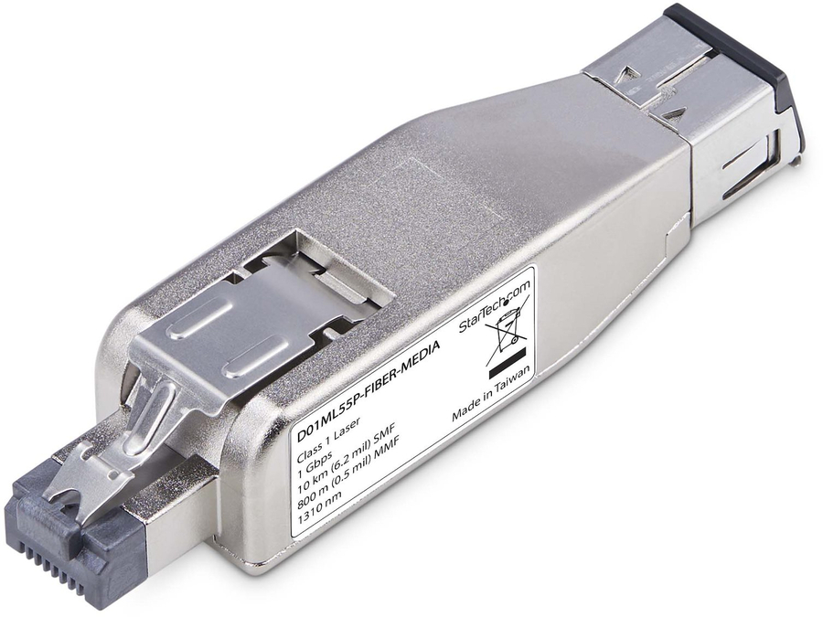 The unmanaged fiber media converter features a plug-and-play design that does not require additional software or settings to be changed. The metal housing features an IP20 rating and is an all-in-one construction with integrated LC fiber and RJ45 ports. The RJ45 side features a metal tab to ensure a reliable and secure fit and prevent accidental disconnections.