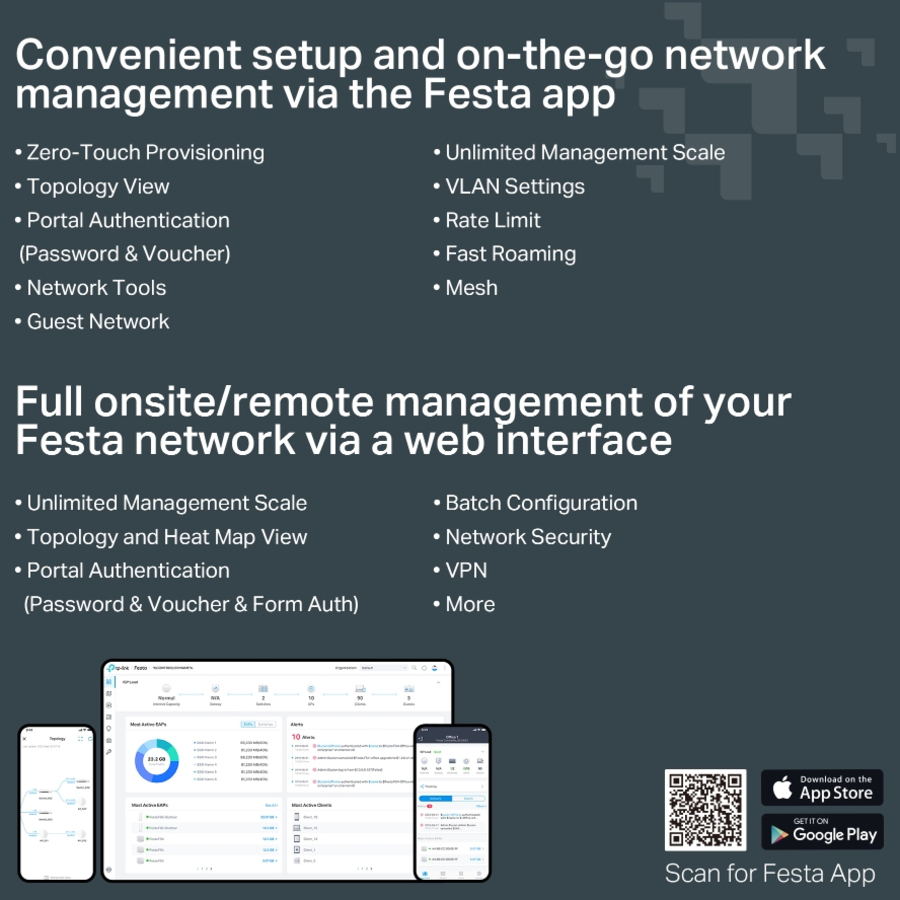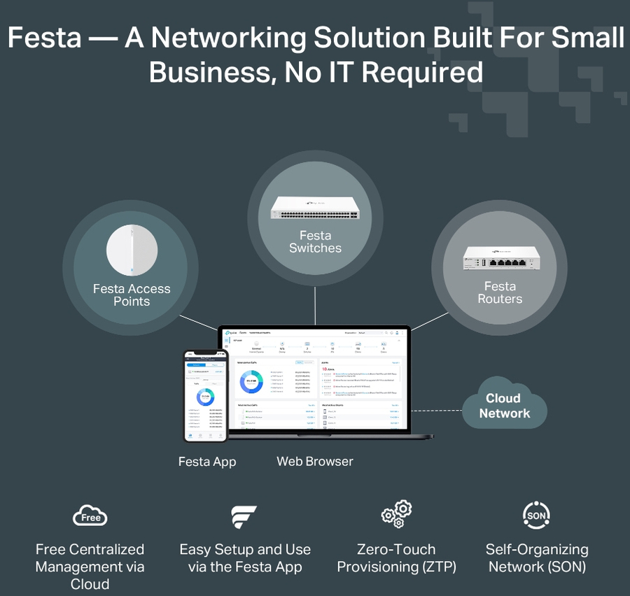 Festa 一 A Networking Solution Built For Small Business, No IT Required Festa offers business-class features with consumer-inspired simplicity. Our free cloud-based centralized management is accessible via the Festa app or web, providing essential features for small businesses without the complexity required by larger-scale operations.