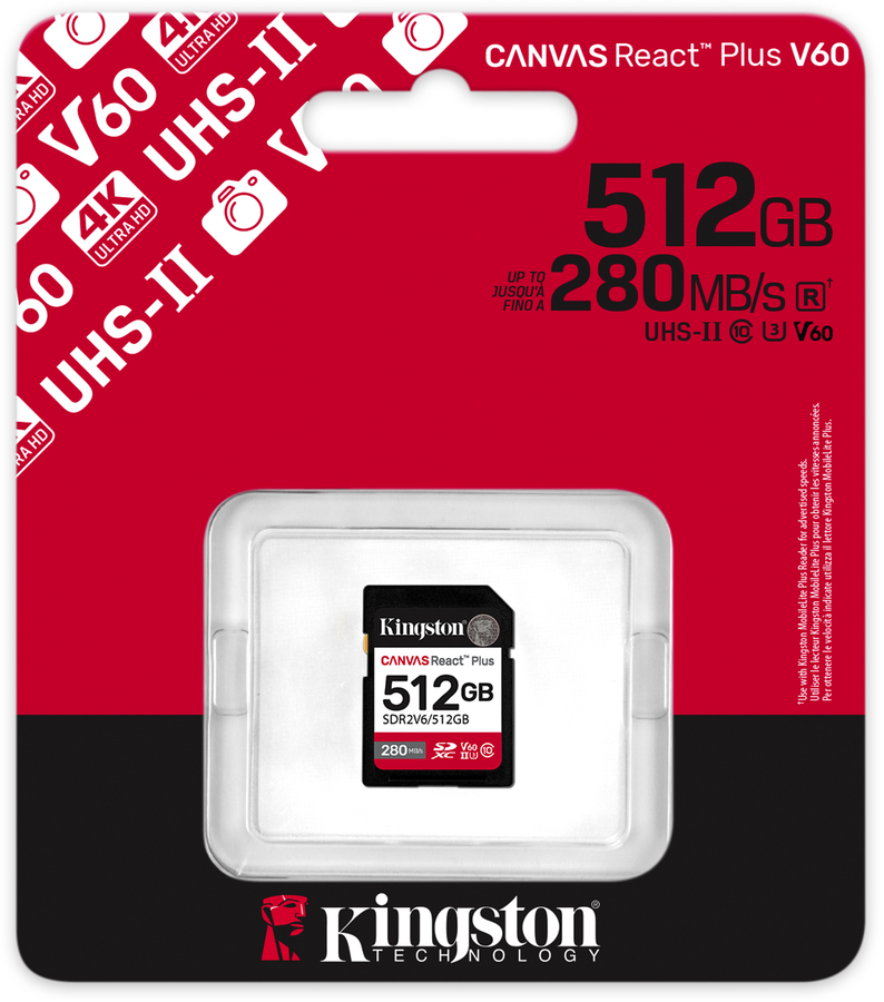 Canvas React Plus V60 SD memory card for 4K professional UHS-II cameras. Kingston’s Canvas React Plus SD card is tailor-made for entry-level UHS-II photography enthusiasts, providing impressive performance that complements standard UHS-II cameras used by budding creatives capturing 4K at higher frames per second (fps) than UHS-I. The card boasts U3 and V60 speed classes with transfer speeds of up to 280MB/s* and capacities of up to 1TB**. Say goodbye to sluggish speeds and dropped frames, ensuring a seamless creative process that enhances workflow and efficiency.