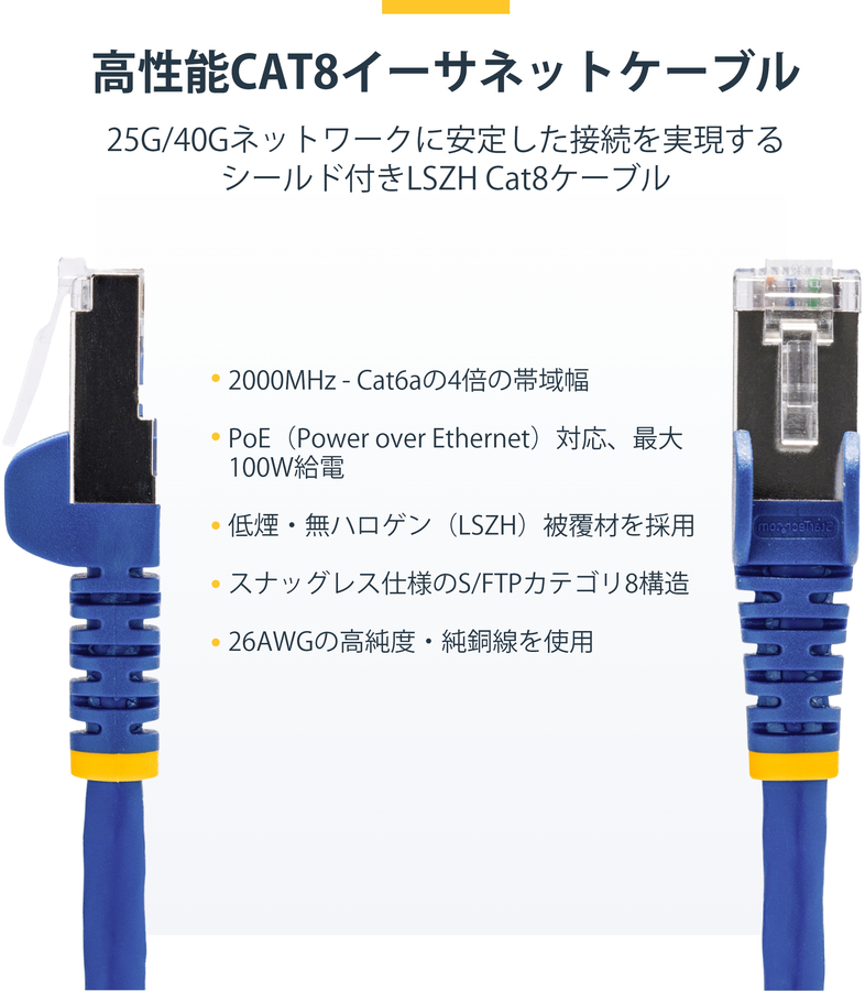 The Cat8 Ethernet Cable features snagless 50-micro gold-plated connectors that enable a precise fit to minimize wear and are rated beyond 750 connector mating cycles. The flexible Low Smoke Zero Halogen (LSZH) flame-retardant jacket emits low smoke and toxic fumes when exposed to extreme heat or in the event of a fire. This enables safer installations in poorly-ventilated areas including some industrial settings, self-contained environments such as trains and aircraft, as well as residential settings where compliance with building codes must be considered.