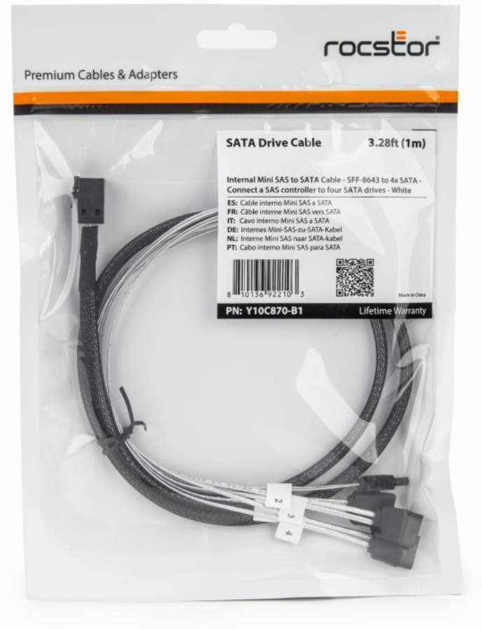 The Internal Mini SAS to SATA Cable 3.2ft (1m) SFF-8643 to 4x SATA is a cost-effective solution for connecting a SAS or SATA controller to four SATA drives. Ideal for replacing your SFF data-storage cables, this cable ensures reliable and efficient data transfer. Compatible with 6Gbps SATA drives, it provides a robust and dependable connection, enhancing your data storage capabilities. Backed by Rocstor lifetime warranty and free technical support.                             |