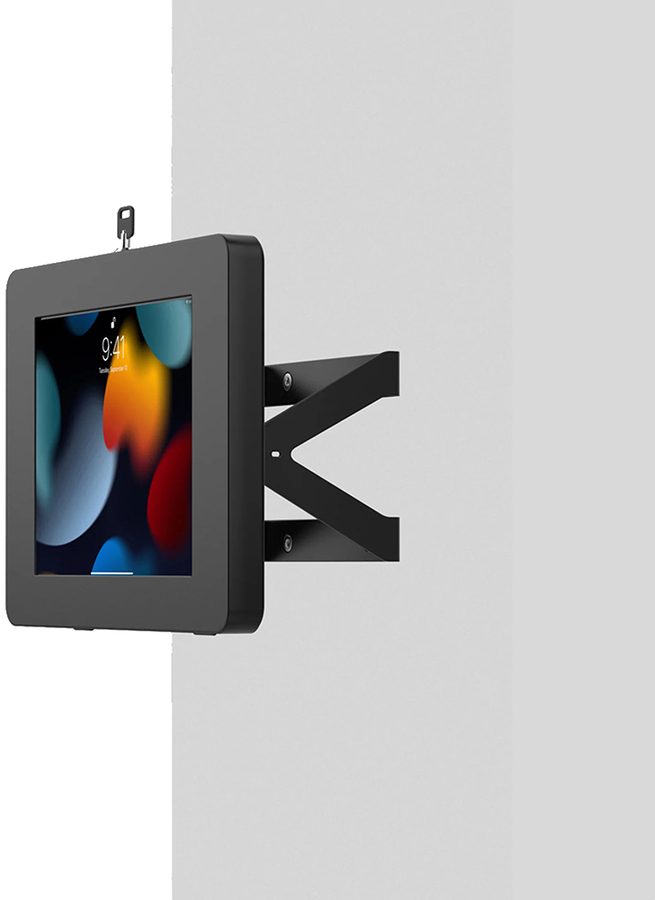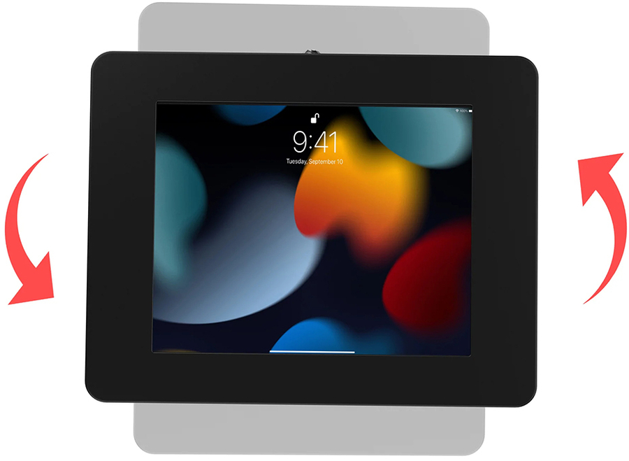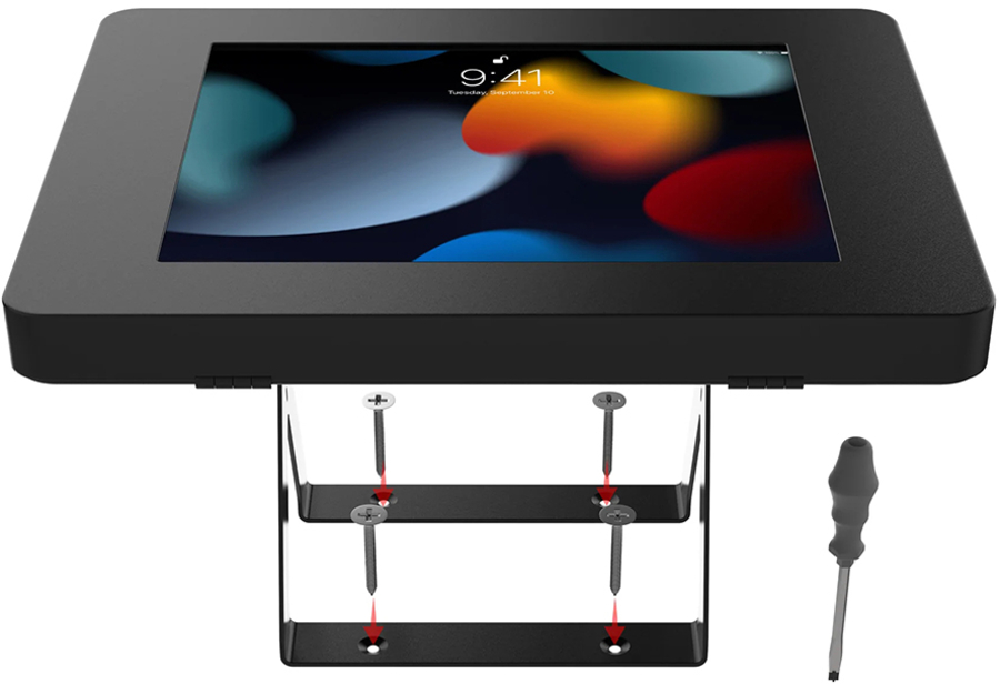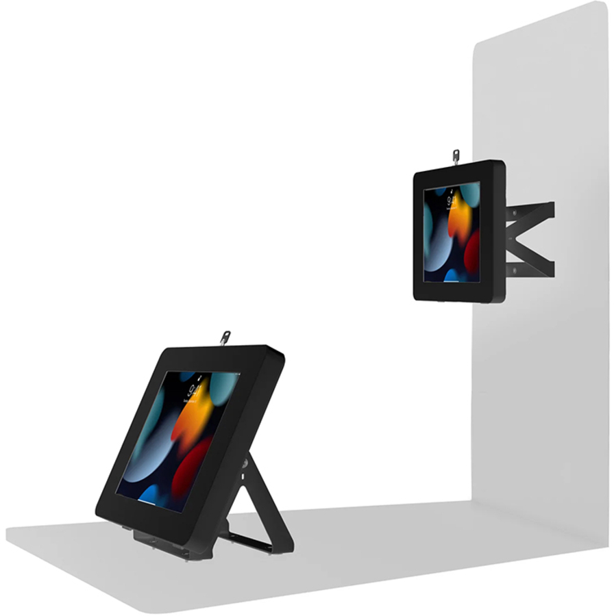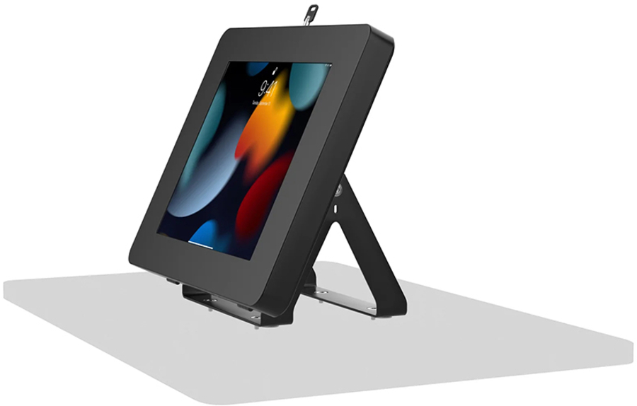 This versatile desk mount is the perfect tablet stand for retail transactions, school tutoring, hospitality counters, or any place you need the ability to fully tilt your tablet to face the opposite direction. The sturdy metal base can be permanently mounted to any horizontal surface via pre-drilled holes, but is also heavy enough for use even without screwing it down. This kit comes complete with an included Paragon Enclosure, which keeps tablets protected with a secure lock-and-key system. It attaches to the desk mount via a standard VESA mounting plate, which rotates for use in either portrait or landscape orientation. A pre-drilled hole through the center of the mount allows the added protection of a Kensington Cable, to loop and lock to a table leg, wall pipe or other permanent fixture (not included). Compatible with 7-11” tablets. |
