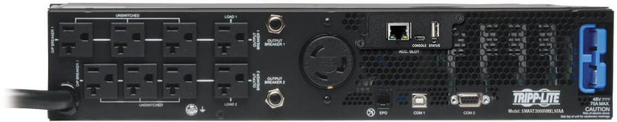 - Federal Trade Agreements Act / TAA Compliant for GSA Schedule purchases - Tripp Lite SM3000RMXLNTAA line interactive 2U rack/tower UPS with 3000VA / 3kVA capacity and extended runtime options - Line interactive UPS with Automatic Voltage Regulation (AVR) corrects brownouts and overvoltages from 83 to 145V - NEMA L5-30P input plug; 8 NEMA 5-15/20R and 1 L5-30R output receptacles, Two independently switchable output load banks - Maintains uninterrupted operation of connected networking equipment during blackouts, surges, brownouts and overvoltages - High 96% efficiency rating in line-power mode offers reduced power consumption and BTU emisssions - Internal batteries offer 10 minutes at 50% load (1440W) and 3 minutes at 100% load (2880W) - Extended runtime is available with optional BP48V24-2U (limit 1), BP48V60RT-3U (multi-pack compatible) and BP48V27-2US (multi-pack compatible) external battery packs - External battery configurations require the use of Tripp Lite's External Battery Configuration Software (see manual) - Hot-swappable, user-replaceable internal batteries and external battery packs can be replaced with no disruption to connected equipment - Front panel LCD monitoring screen with MODE and ENTER buttons reports operating mode with 5-bar battery charge graphic, plus 7 selectable screens of detailed UPS and site power information - LCD interface also supports a number of advanced user setup and operating preferences - Ships with 4 post rackmount installation hardware; Optional 2POSTRMKITWM enables 2 post rackmount/wallmount installation; Optional 2-9USTAND enables tower placement - Network interfaces support communications via built-in USB, DB9 serial / contact-closure and pre-installed WEBCARDLX network management card - WEBCARDLX interface allows full remote access for power monitoring, configuration, control and email notifications via secure web browser, SNMP, Telnet, SSH or Command Line - Optional E2 sensors enable site monitoring of temperature, humidity and contact-closure status - Reduce Service Calls with Auto Probe Autonomous Device Management. The Auto Probe feature (Firmware 15.5.2 and greater) of the LX Platform Interface checks the connectivity status of any networked device and automatically takes one or more user-configured actions if the device fails to respond; actions include outlet reboot, set SNMP traps, SNMP OID sets, and even script execution when used in conjunction with the Tripp Lite PowerAlert Network Shutdown Agent (PANSA) - HID-compliant USB interface enables integration with built-in power management and auto shutdown features of Windows and Mac OS X - USB & Serial ports enable data-saving unattended shutdown when used with Tripp Lite's PowerAlert software, available via FREE download from www.tripplite.com/poweralert - Built-in Emergency Power Off (EPO) interface with cable