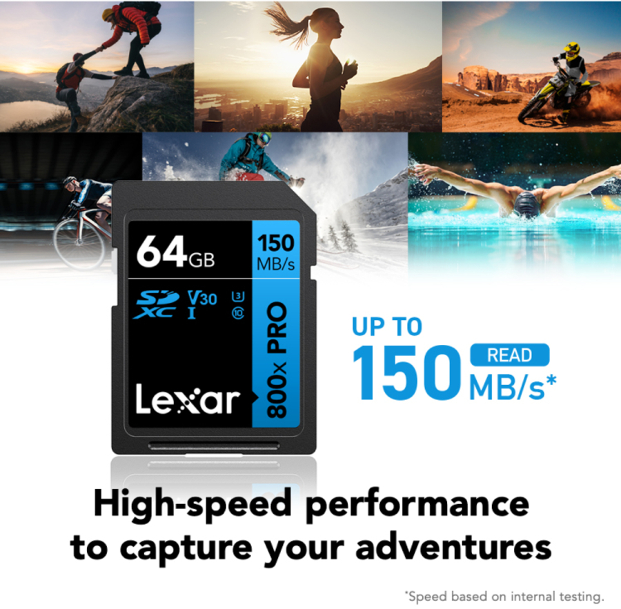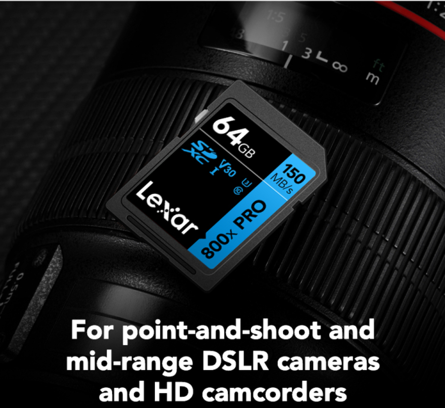 Shoot Stunning, High-quality Images and 4K UHD Videos Lexar® High-Performance 800x PRO SDHC™/SDXC™ UHS-I Cards BLUE Series are designed for point-and-shoot and mid-range DSLR cameras and HD camcorders. They feature fast transfer speeds of up to 150MB/s so you can perfectly capture and quickly transfer high-quality images and 4K UHD video.