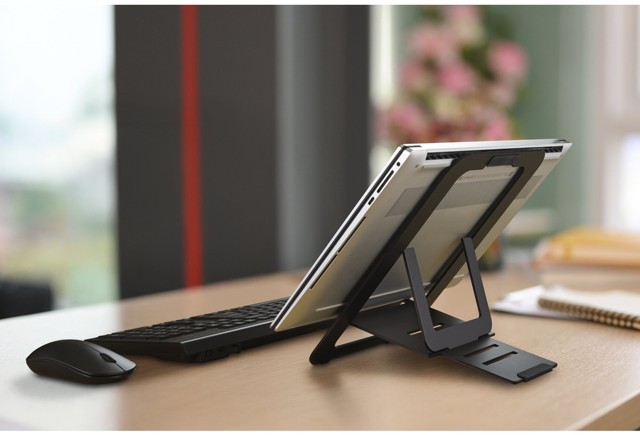 Maximize workstation comfort at home or on the go with the ergonomically designed EQ Adjustable Aluminum Laptop Stand. Featuring higher lift options than standard risers, this versatile stand offers adjustable height and angle settings to elevate your laptop or tablet screen to a comfortable viewing position. Recommended by the German IGR Institute for Health and Ergonomics, its durable aluminum construction accommodates devices from 10 to 17 and up to 6.6lbs (3kg). Lightweight and portable, the stand folds flat for travel and complements any setup. Anti-slip silicone foot pads ensure your device remains secure, while heat dissipation channels enhance device longevity. Made from 100% recyclable aluminum* and shipped in FSCĀ® certified packaging. *Aluminum is recyclable, but not always accepted in curbside bins. Check with your local facility and remove all non-aluminum parts before recycling. |